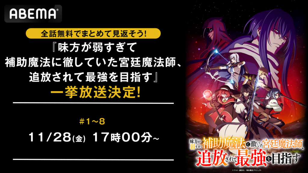 ABEMAにて『味方が弱すぎて補助魔法に徹していた宮廷魔法師、追放されて最強を目指す』#1~#8の無料一挙放送が決定