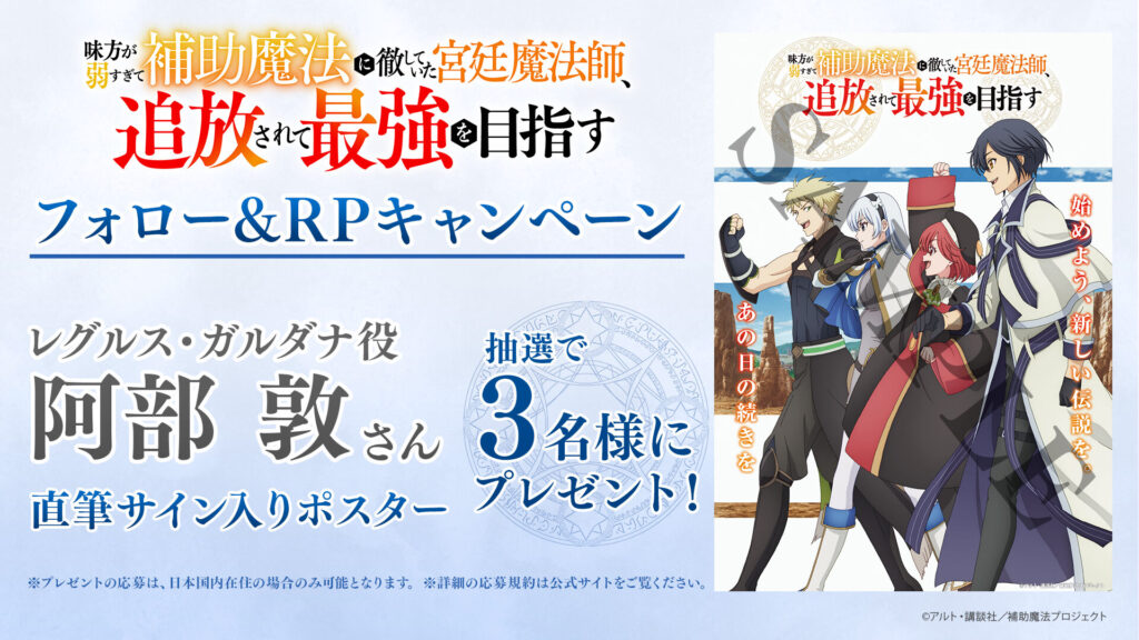 - 当選された方にはTVアニメ「味方が弱すぎて補助魔法に徹していた宮廷魔法師、追放されて最強を目指す」公式アカウント(@hojomaho)よりダイレクトメッセージでの連絡になるため、受信できるように、あらかじめ設定ください。